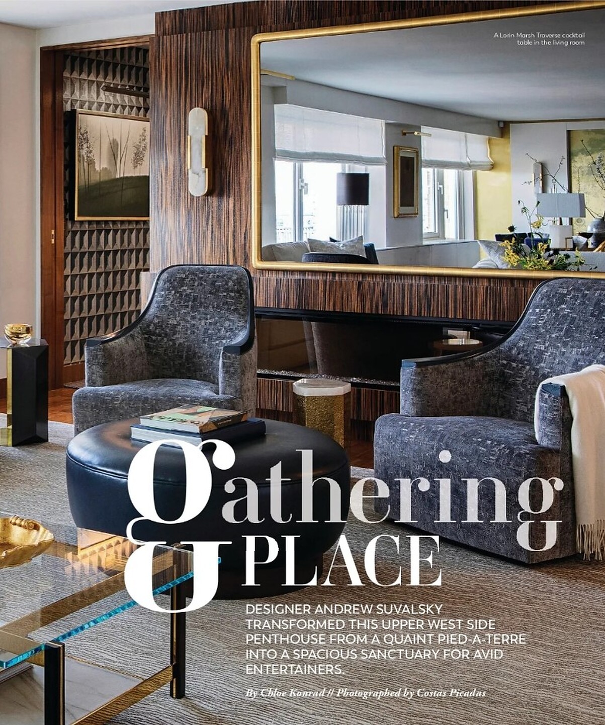 In the article "Gathering Place" interior designer Andrew Suvalsky featured Coffered Wood 4259 Beach House in the hallway of a clients home.