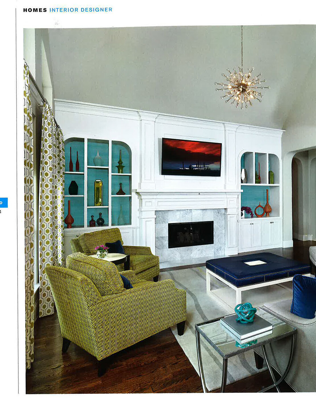 In article "Bold Move," interior designer Barbara Gilbert featured Bermuda Hemp 5252 Turquoise lining the back of the shelves in the living room of a client's home.