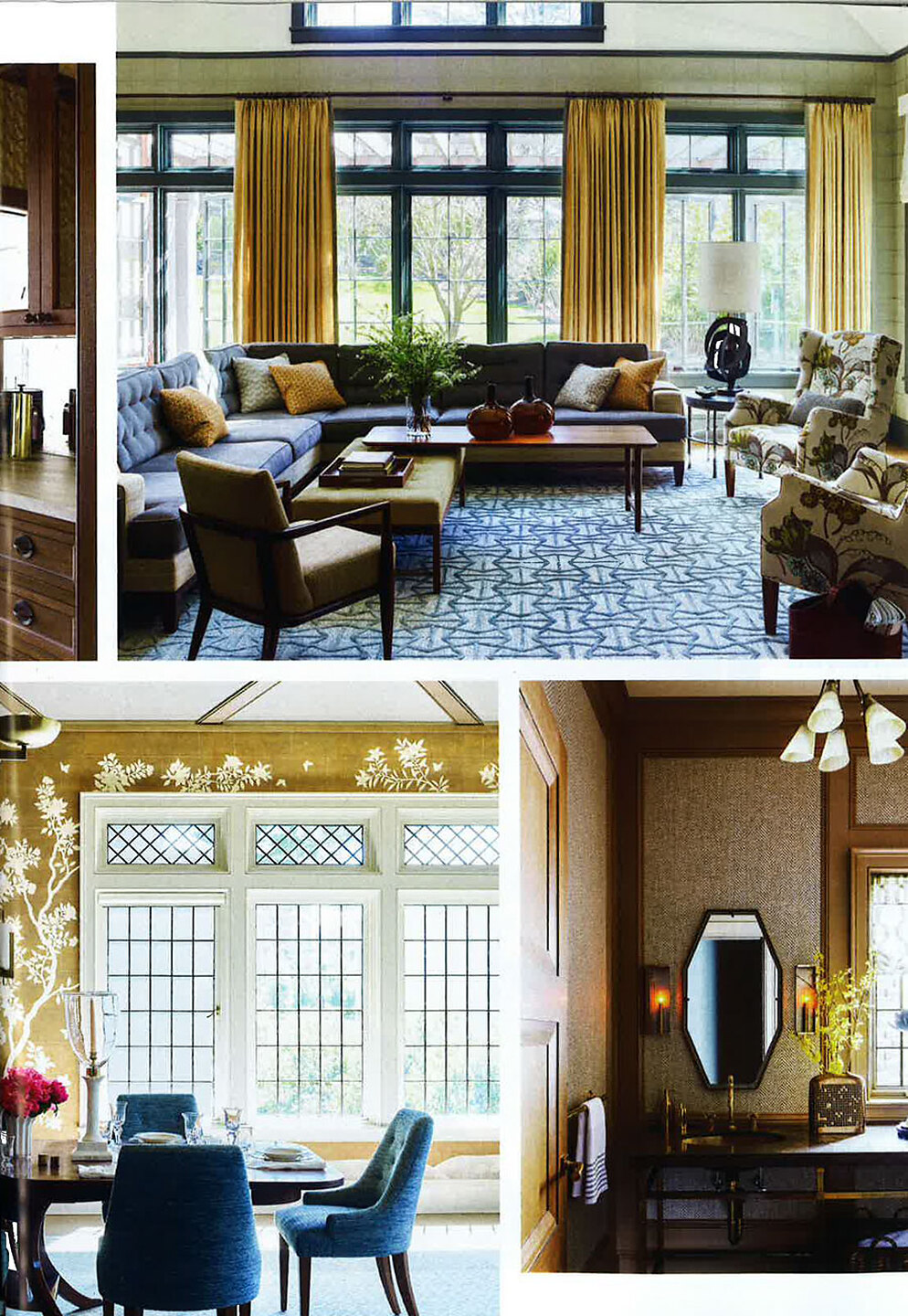 In article, "Manor Reborn," Interior designer Gideon Mendelson featured Framed 5732 Ice Blue in the living room of a client's home and Chevron Chic 3294 Elephant Tusk in the powder room of a client's home.